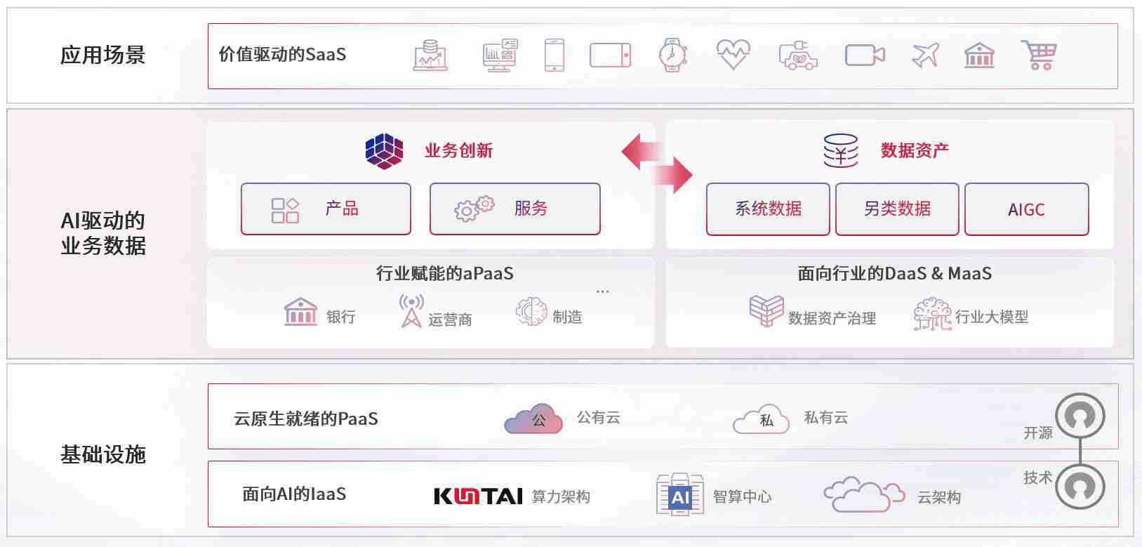 数字时代,,围绕企业数字化转型的关键要素,,,,尊龙z6数码开创性的提出数云融合战略和技术体系框架,,,,着力在云原生、、、数字原生、、AI原生和信创产业上架构产品和服务能力,,,为处在不同数字化转型阶段的快消零售、、、、汽车、、、金融、、、、医疗、、、政企、、、教育、、运营商等行业客户提供泛在的敏捷IT能力和融合的数据驱动能力,,,,构建跨界融合创新的数字业务场景和新业务模式,,,,助力企业级客户建立面向未来的核心能力和竞争优势,,全面推动社会的数字化、、、智能化转型升级。。。